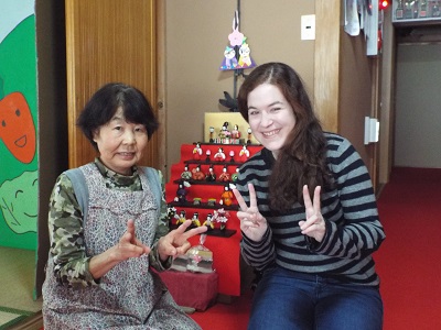 繭クラフトメンバーで制作のひな壇の前でソフィアゴードさんみづの荘女将で、