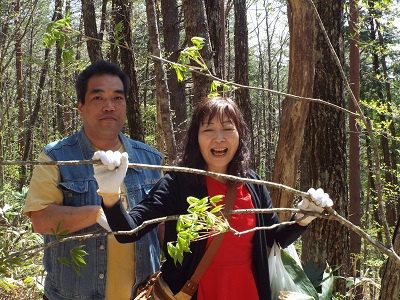山菜収穫体験みづの荘の山でしいたけ収穫