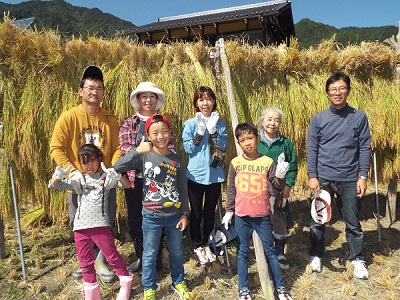 晴天の下でのんびりゆっくり稲刈り、はざ干しと汗を流していただきました。